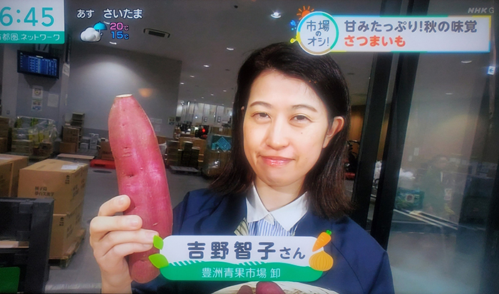 NHK「首都圏ネットワーク 市場のオシ!」コーナー、我らが豊洲市場 女性パイオニアセリ人 吉野智子さんがさつまいもをプレゼンしてくれましたー😄🍠🍠🍠#政義青果 #豊洲市場 #東京シティ青果 #首都圏ネットワーク