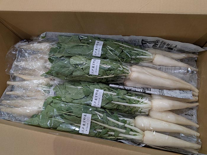 今朝の豊洲市場・政義青果、江戸東京野菜の亀戸大根が入荷しました♫ 白い茎が特徴的、江戸っ子に春を告げる野菜です😃#政義青果 #豊洲市場 #亀戸大根 #亀戸だいこん #江戸東京野菜