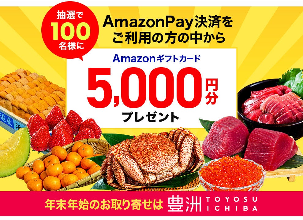 「うまいもんドットコム」など、こだわり食品のインターネット販売を主としてビジネスを展開する株式会社食文化(東京都中央区、代表:萩原 章史)は、2022年12月1日 木曜日より運営する「豊洲市場ドットコム」において、抽選で100名様にAmazonギフトカード5,000円分をプレゼントするキャンペーンを開始します。ECサイト内のお買い物でAmazon Pay決済をご利用の方が対象です。年末年始のお取り寄せは、豊洲市場ドットコムで!詳細はウェブの特集をご覧ください → https://www.tsukijiichiba.com/user/collection/1340