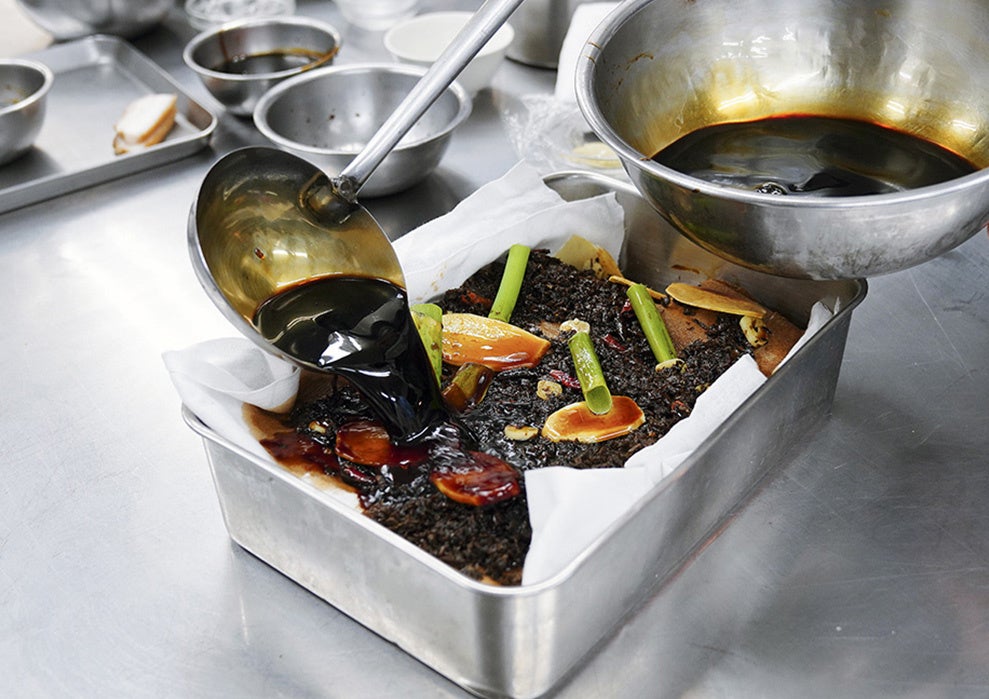 味の決め手は、本場四川省から取り寄せた、伝統的な漬物「芽菜(ヤーツァイ)」です。これをにんにく、しょうが、唐辛子でよく炒めておきます。中国醬油、甜醤油、さまざまな香辛料と共に、炒めたヤーツァイを入れ特製ダレが完成です。ヤーツァイを加えると漬物独特の香りとうまみの濃い塩味が加わります。