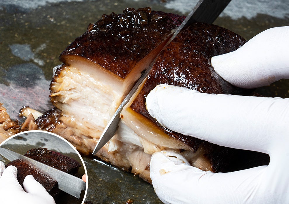 アメリカで生まれた複数種類を掛け合わせて生まれたハイブリッド種、「バブコック・スワイン」です。脂が甘く、滑らかな肉質が特徴のこの肉の中でも、月に数度程度しか出て来ない「皮付きのバラ肉」を使います。