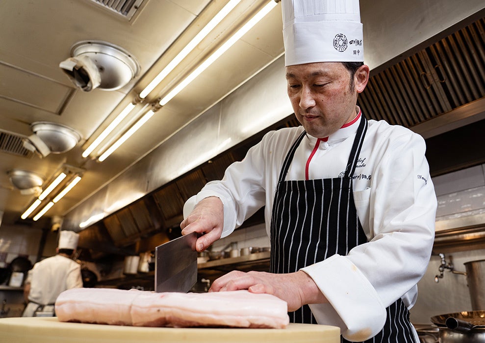 「皮付きのバラ肉を塊のまま蒸さないと、この食感とジューシーさはでませんから」と、田中料理長。水俣で出会ったこだわりの豚肉を最高の一品に仕上げました。