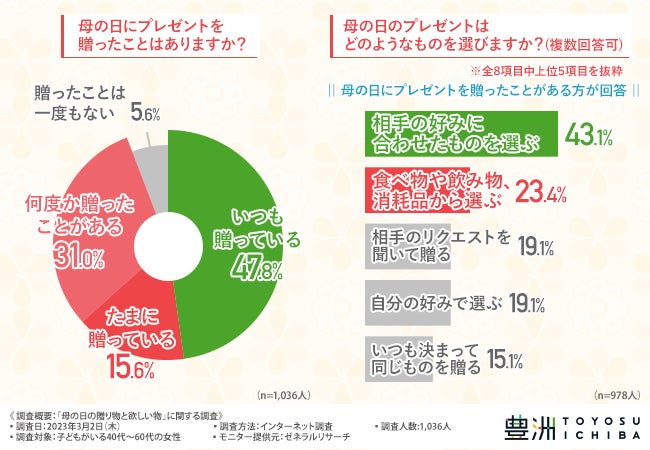 そこで今回、豊洲市場ドットコム (https://www.tsukijiichiba.com/user/collection/126)を運営する株式会社食文化 は、子どもがいる40代~60代の女性を対象に、「母の日の贈り物と欲しい物」に関する調査 を実施しました。