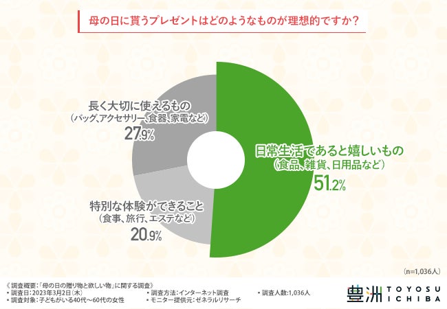 「母の日に貰うプレゼントはどのようなものが理想的ですか?」と質問したところ、『日常生活であると嬉しいもの(食品、雑貨、日用品など)(51.2%)』 と回答した方が最も多くなりました。