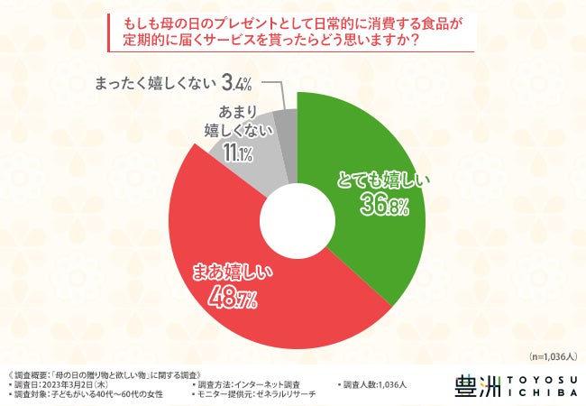 そこで、「もしも母の日のプレゼントとして日常的に消費する食品が定期的に届くサービスを貰ったらどう思いますか?」と質問したところ、8割以上の方が『まあ嬉しい(48.7%)』『とても嬉しい(36.8%)』 と回答しました。