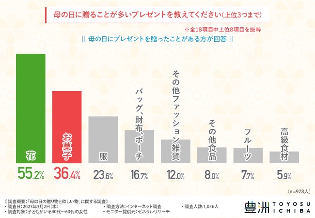 「母の日に贈ることが多いプレゼントを教えてください(複数回答可)」と質問したところ、『花(55.2%)』 と回答した方が最も多く、次いで『お菓子(36.4%)』『服(23.6%)』 と続きました。