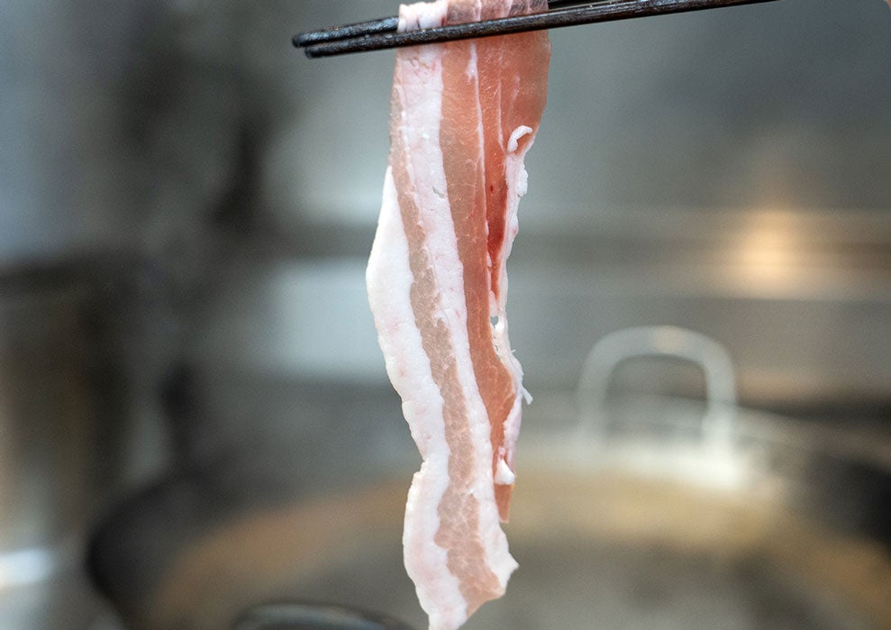 冷やしサンラー麺では、脂の甘さ、赤身の旨さが揃ったモンヴェールポークのバラ肉を使用します。