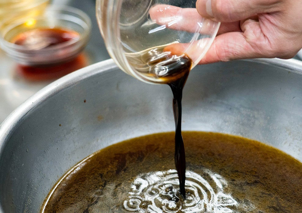 日本のお酢に、中国の黒酢「鎮江香醋」を使用しています。酸味にカドが出ないように酢を落ち着かせ、コクがありながらもキリっとさっぱりした味わいになるようブレンドしています。