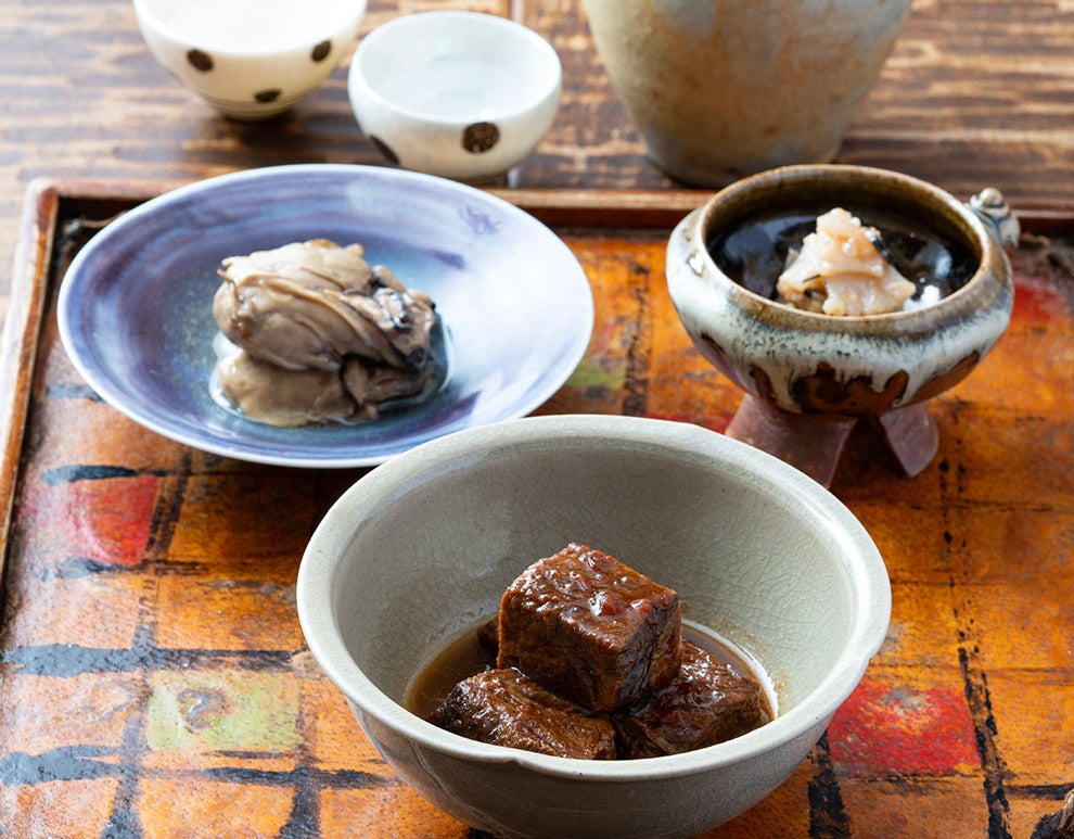 東白庵かりべの「冬のそば前」3品 和牛ほほ肉の味噌煮・牡蠣のオイル煮・皮くじら