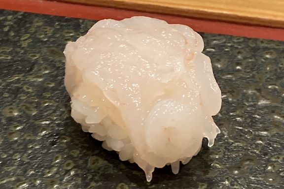 松月の名物「福団子」は、白エビをすり身にして串にし、炭火で香ばしく炙ったものです。一本に使う白エビは、なんと約200尾。 コースの一品として、客の目の前で丁寧に焼き上げるのが松月流です。炭火で炙られてふわりと立つ香り、口に入れるとねっとりとほどける食感、淡いエビの香りが鼻に抜ける上品な味わい。この一串が、白エビの魅力を一気に引き上げたというのも納得です。