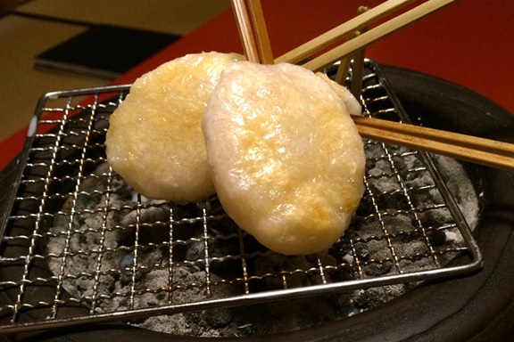 料亭「松月」の名物「福団子」。1本に約200尾の白エビを使ったすり身を炭火で炙る。