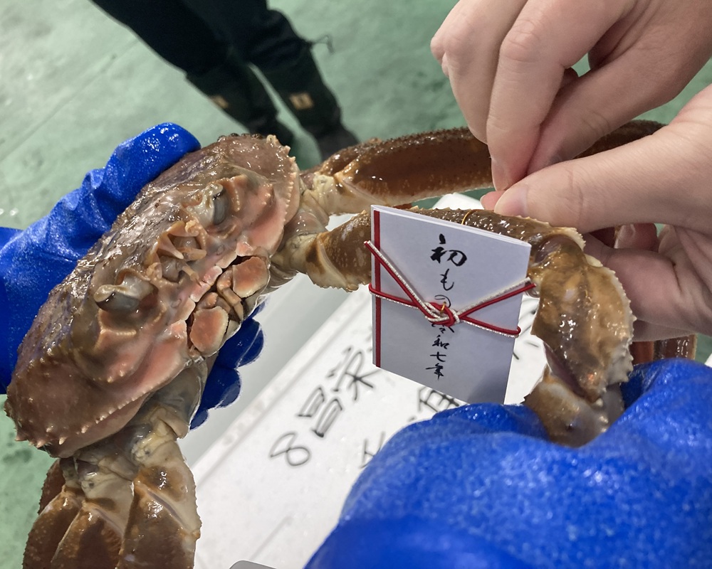タグ、多いですね。しかもこの日は初物と言うことで、「初物ダグ」もつけられていました。たくさんのタグを結ばれた蟹は、いったいどんな気持ちなんでしょう。