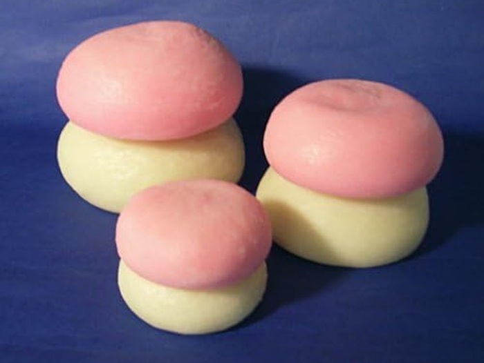 ピンクと白の丸いもの。これ、何だと思いますか?つぶれた紅白饅頭のようですが、実は、お正月に飾る鏡餅なんです。鏡餅といえば普通、大小の白い丸餅を重ねたものだと思われるのですが、金沢では、白い丸餅の上にピンクの丸餅を重ねます。一番上に橙の実をのせること、おうちの格式や床の間などの飾る場所の大きさによって餅の大きさが変わること、大きな餅は立派な三方の上に裏白や柿串と一緒に飾ることなどは、ほかの地域とほぼ同じです。ただ、餅が紅白。おめでたいといえば確かにそうなのですが、金沢に越してきた当初、この紅白の鏡餅を見たときは、驚きました。