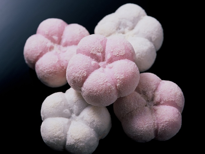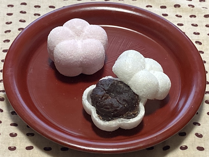 そしてもうひとつ、紅白のもの。梅の形をした紅白のもなかで「福梅(ふくうめ)」という和菓子です。大きさは店によって違いますが、概ね4センチほど。餅米を使った皮には雪を模した砂糖が薄くまぶしてあり、中のつぶあんには飴が練り込まれています。そうです。ご想像通り、ものすごく甘いのです。これは、和菓子職人に正月休みを与えるため、日持ちを良くする必要があったからだとか。