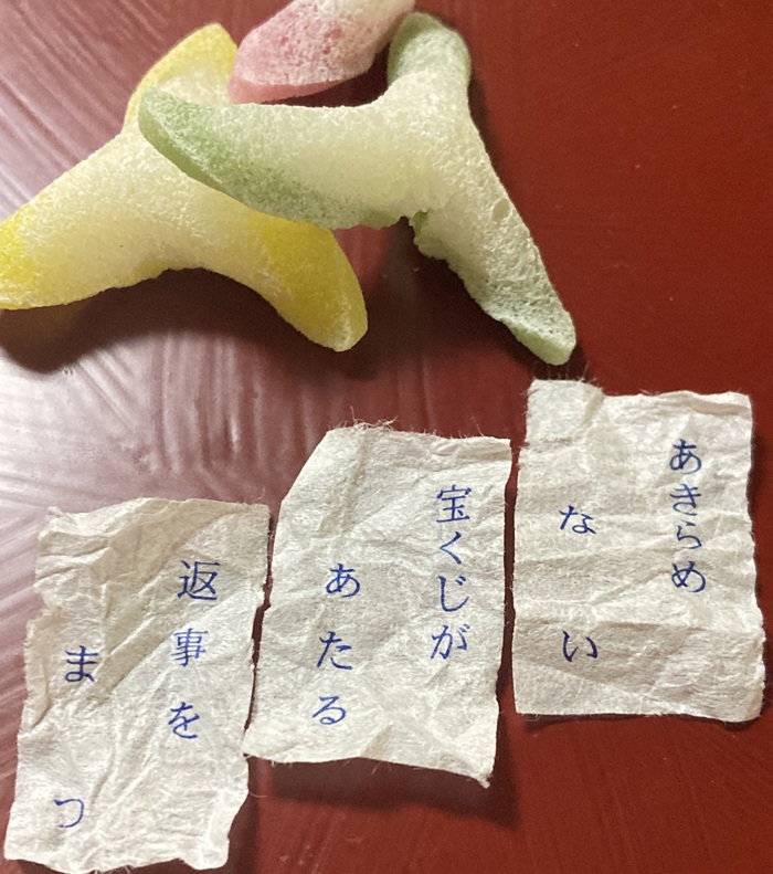 辻占は、金沢版フォーチュンクッキー。ちなみに2025年の正月、私の辻占は「返事を待つ」「宝くじがあたる」「あきらめない」でした。残念ながら、この1年、宝くじはあたりませんでした(笑)。
