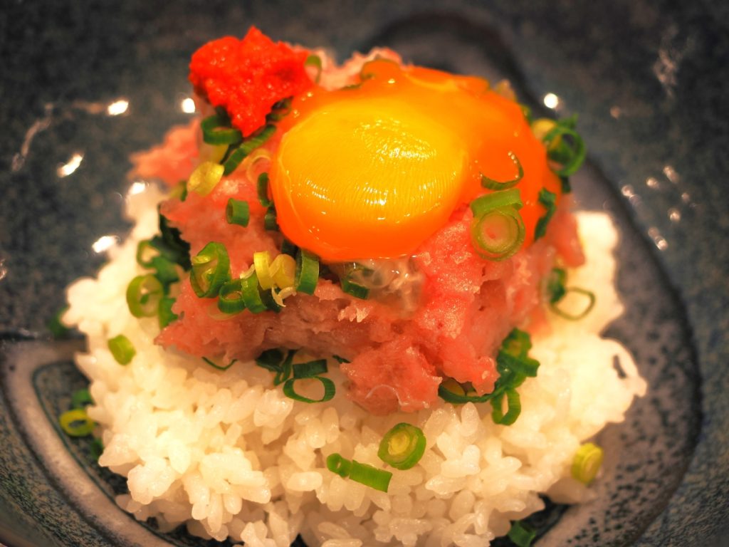 豆板醤の辛味がマグロの味を引き立てて、後を引くうまい丼に仕上がります。