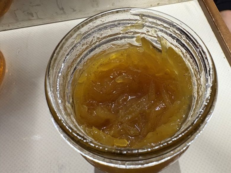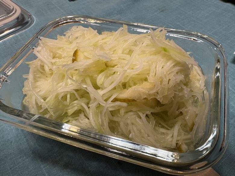 こちらは津奈木での、河内晩柑のジャムと、味付けしてジャムを和えた状態の、完成した青パパイヤのなますです。ひと晩、寝かせました。
