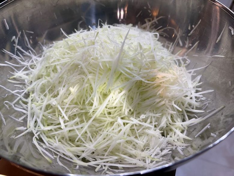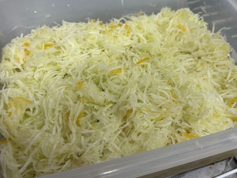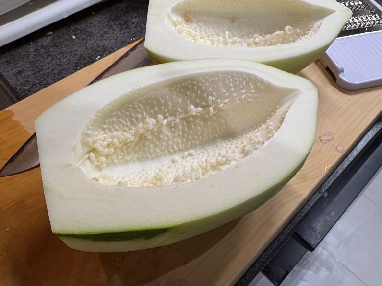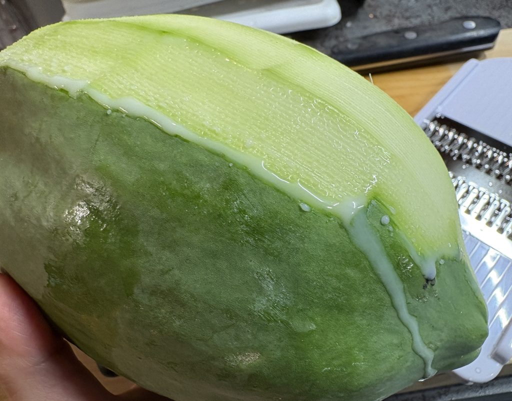 表面の皮をむきます。むいたところから溢れだす酵素が恐ろしいくらいに滴ってきます。。皮は捨てずにお肉とかに入れ込んで活用しても良いかもしれません。皮の活用方法ももっと考えていきたいと思います。半分にカットしたら、内側の種を取り除きますが、ほとんど入っていないため、そのまま「シリシリ」スライサーでシリシリ。