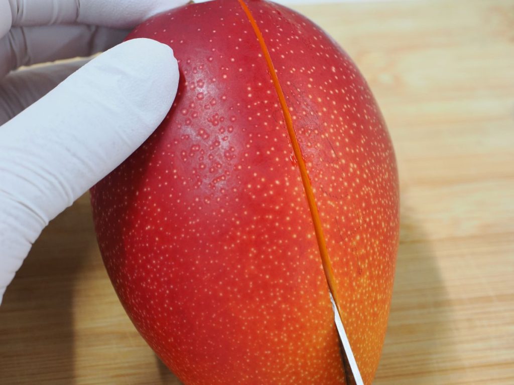 まずはマンゴーには大きな種があるので、そこをよけて包丁を入れてください。