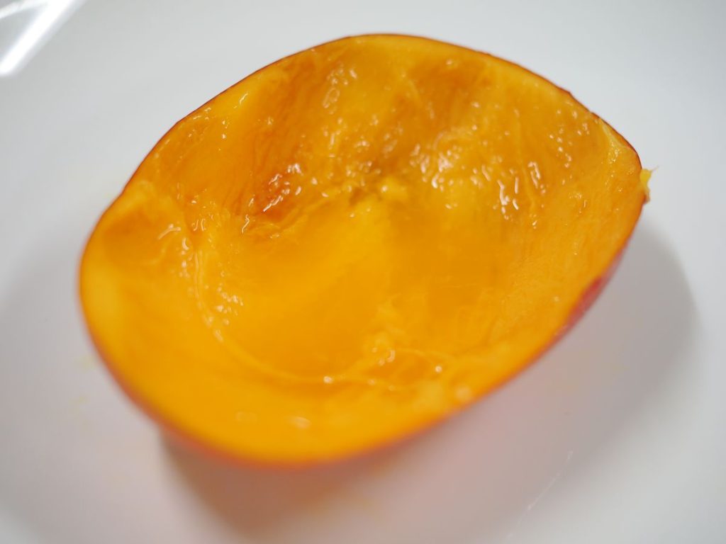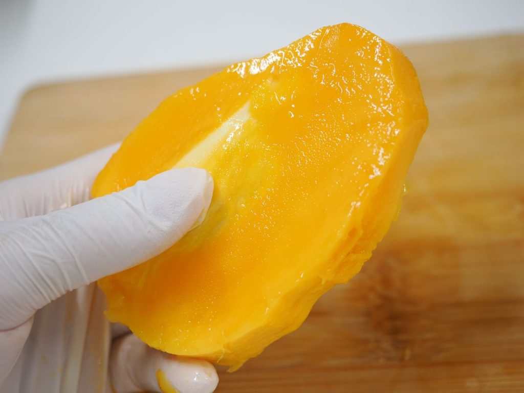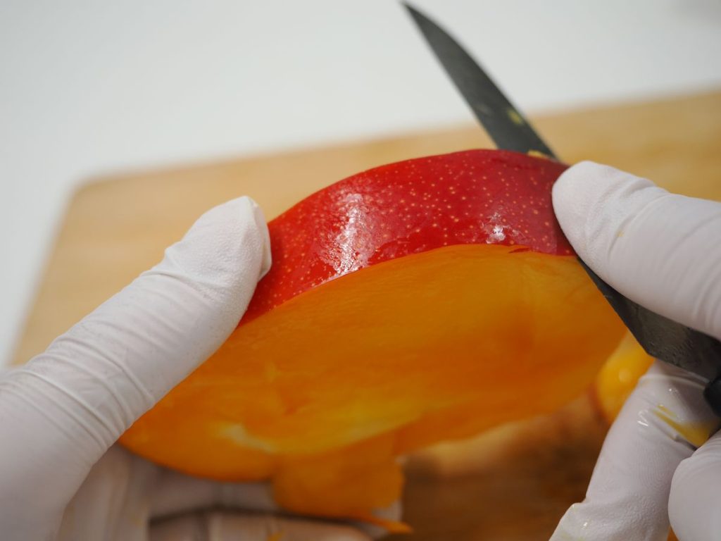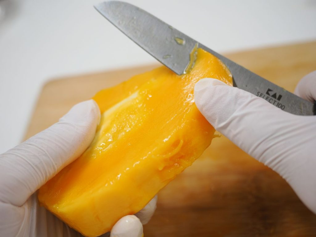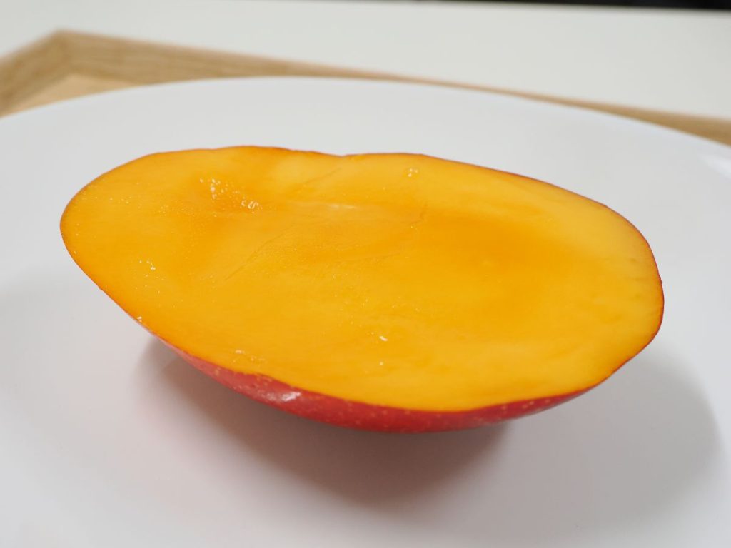 さらに、ダイスカットをすると、どうしても果汁の流出・切断面の乾燥がありますが、この方法であればそれもなく、マンゴーの香り、果汁を独占して、余すところなく楽しめます。