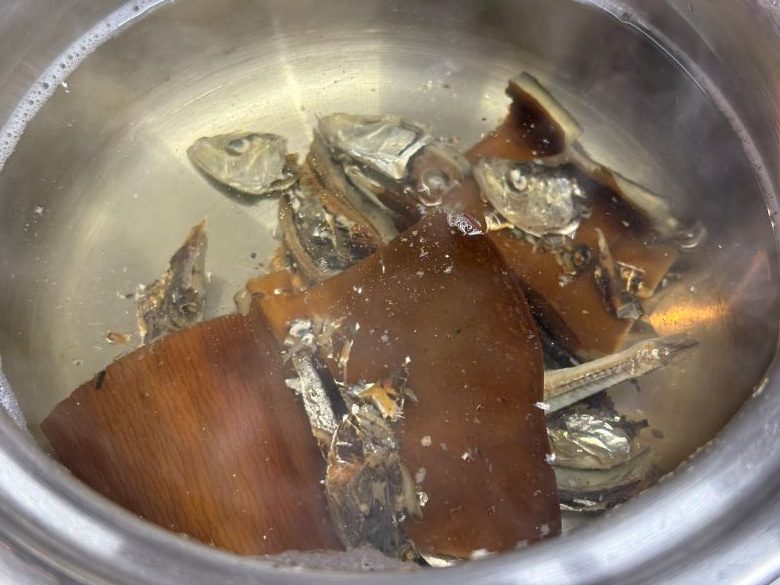 この日は羅臼昆布(釧路出張の時に大量に買い込んできます)と煮干しで出汁をとり、食べやすい大きさにして出汁の中に投入。