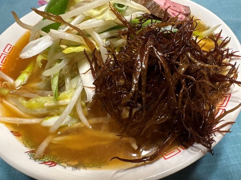 ある日のラーメンにも、ふのりどっさり!野菜にも負けずに山盛りにしていただきます。磯の香りが味噌ベースのラーメンにぴったりです。