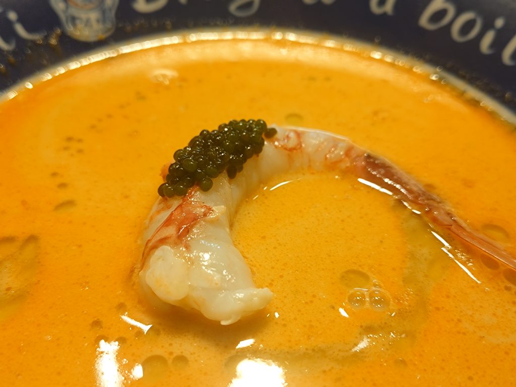仕上げに生クリームを加え、塩胡椒で味を整える。スープで身をさっとしゃぶしゃぶし、ビスクの上にのせ、漬け卵を添えて完成。ビスクは濃厚で、甲殻の旨味がしっかりと出た一杯。卵のぷちぷちとした食感が、いいアクセント。