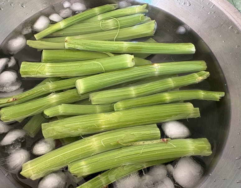 皮を剥いで熱湯にくぐらせ、氷水で冷やします。半日から一日水を変えながら酸を抜きます。