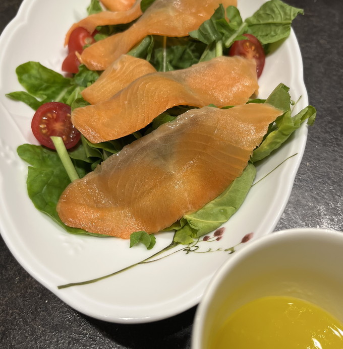原材料は宮城県産の銀鮭と食塩のみ。pH調整剤やアミノ酸など使用していないこだわりのスモークサーモン。ルッコラにのせてサラダに。ドレッシングは自家製塩レモンの液、四万十のブシュカンのしぼり汁、はちみつ少し、オリーブオイル、塩でつくりました。これがおいしすぎた~。残ったスモークサーモンはクリームチーズを巻いて私のお酒のおつまみに。リピートします。