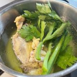 コンソメスープとフライドエシャロットを加え、蓋をして弱火でコトコト約1時間。伊勢海老の旨みがゆっくりとスープに溶け出していきます。
