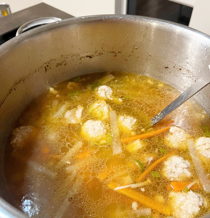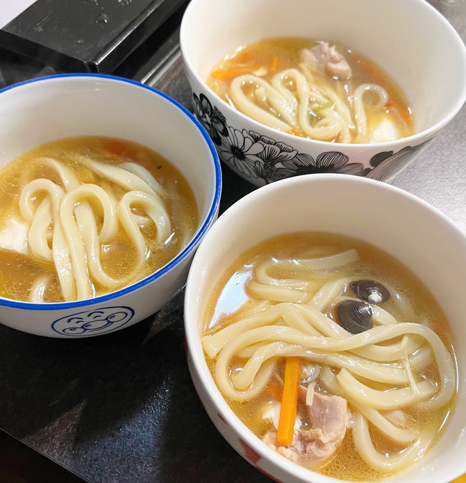 その写真は撮り忘れました・・・そして味付け前に取り分けておいたスープを何にしようかと子供たちに問い合わせたら、「スンドゥブのスープの味でうどんが食べたい!」とのこと。洋風イメージのスープにしちゃったけどここからコリアンに行けるのか・・・と思いましたがいったんやってみました。