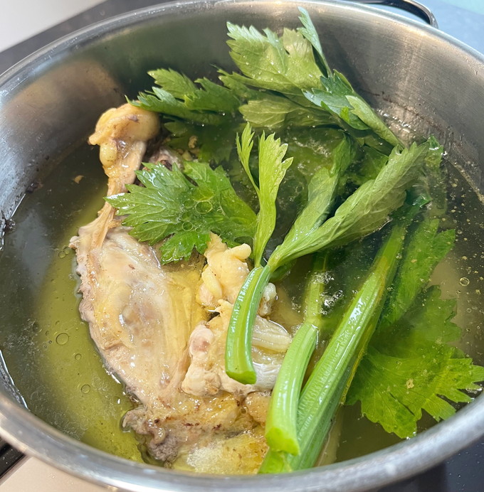 パスタ→唐揚げ→グリル→チキン南蛮で残りはガラ。ガラは冷凍しておき、クリスマス番外編 のポトフにするためにセロリの葉とローリエをコトコト。