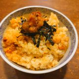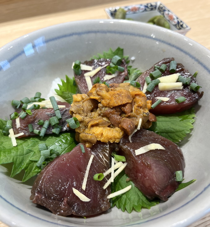 翌日のランチは醤油と酒と少しのみりんで漬けにしたかつおとウニをホカホカごはんに乗せて、しそ、しょうが、ねぎと。そして途中で追いしそ、追いしょうが、さらに海苔で巻いてフィニッシュ。1日漬けるとねっとりが増してまた違った味になります。