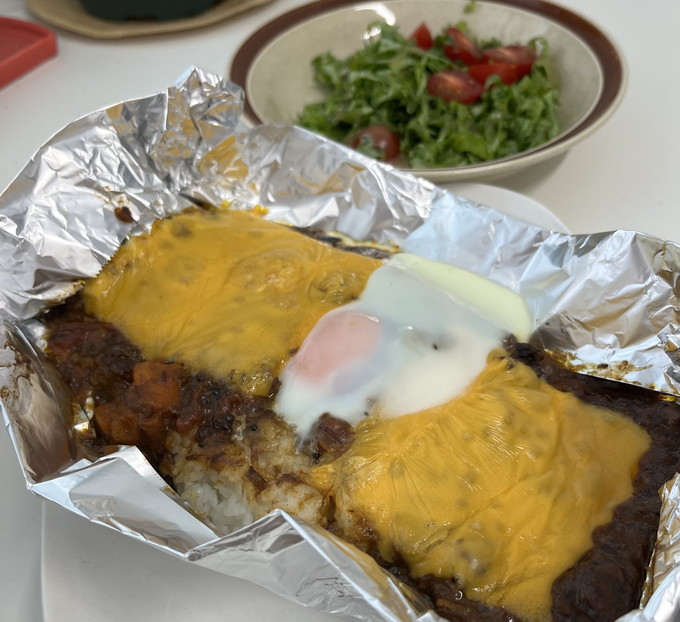冷凍ご飯を温めて、ルーをかけてチーズと卵をのせてトースターで5分。卵はこれまた愛用の緑の一番星。安定のおいしさです。でもせっかくならオーブン皿を買ってスライスチーズではなくシュレッドチーズにして見栄えも気にしようと思いました。次回ドリアかグラタンを作るときには必ずや。
