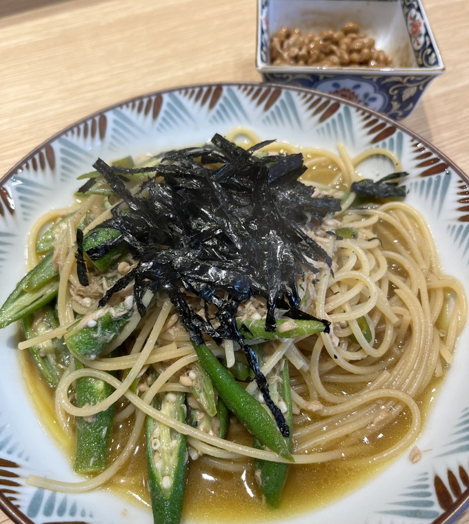 オクラとツナの和風パスタ。オリーブオイルで青唐辛子を炒めて、ツナと茹でたオクラを加えて茹でたスパゲッティを加えて醤油で味を調えただけ。食べるときに黒コショウパラパラ。にんにくとバターを入れるか迷いましたがカロリーと後で納豆と合わさることを考えてやめておきました。青唐辛子を1.5本入れたら、辛っ!汗だく。でも美味しい!そして途中から味変で納豆を加えて。これもまた美味!