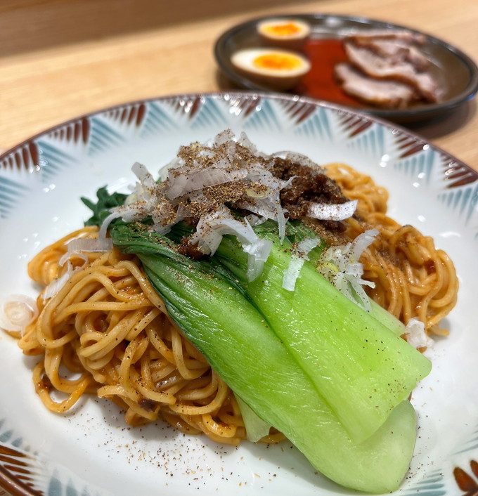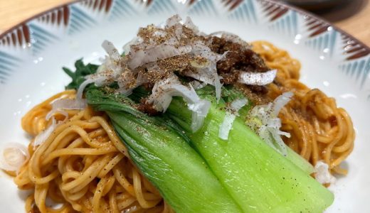 青梗菜を茹でてねぎを刻んで、麺を茹でて付属のたれを絡めて盛り付けたら出来上がり。サイドメニューに昨日の夕飯の残りのチャーシューとゆで卵。フォアジャオかけて、いつもの味。美味しい!
