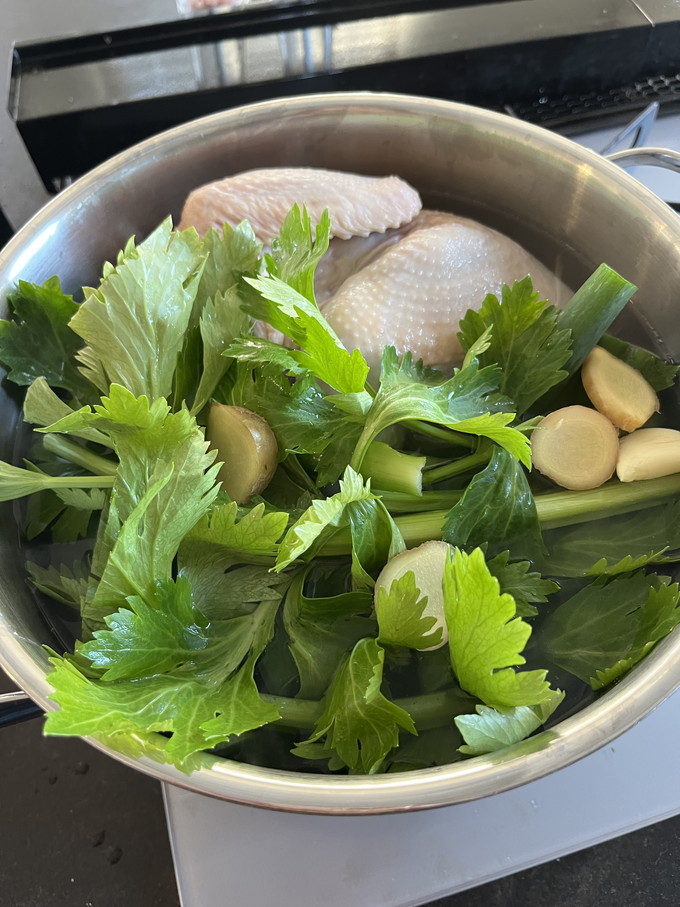 1日かけて冷蔵庫で解凍し、ドリップをしっかりふき取り、鍋に入れます。臭み消しは葱の青い部分とセロリとしょうがとニンニクです。