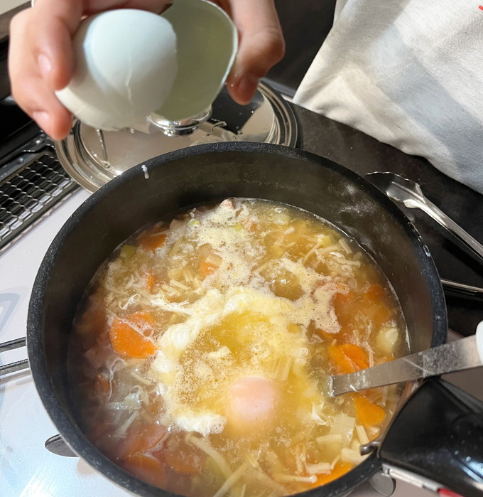 初日は鶏出汁に羅臼昆布といりこと冷凍しじみを加えて、にんじん、長ねぎ、えのき、高知のはちきん地鶏。