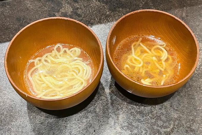 翌日はラーメン。塩と醤油を味見。うわーー。これはあっさりだけど深みのある美味しいスープです。