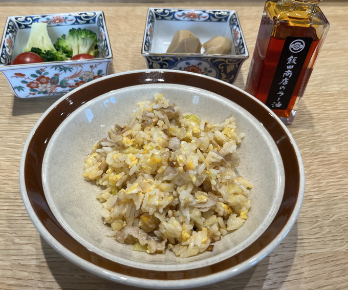 私は残ったチャーハンとブロッコリーとトマト。チャーハン、米がつぶれることなくパラパラにできました。パチパチ。そして家から持ってきたまたもや残り物の里芋の煮物。飯田商店のラー油をチャーハンにかけると、本当においしいのでおすすめです。