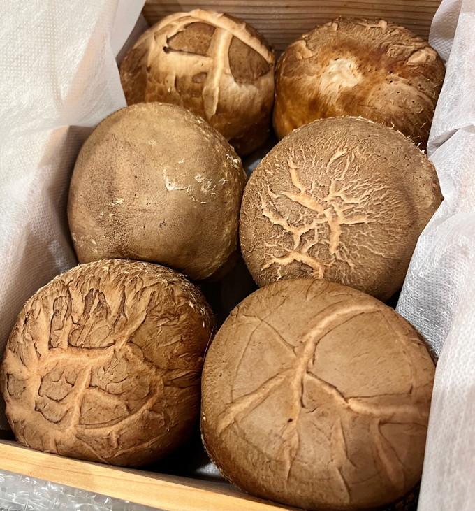 別の日、会社の食事会で使った「齋藤農園の原木椎茸 絹」。しいたけが8000円弱、ハテ、なんで?と思いましたが、写真では伝わらないくらい大きい!わたしのこぶし級の大きさです。それが6個もこんな感じに素敵な木箱に入っています。これは贈り物いただいても話題になるくらいのびっくりしいたけです。