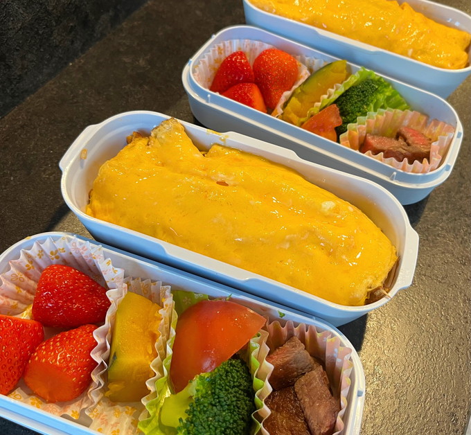 そして翌日は1年生になった双子たちのお弁当にもオムライスと一緒に。贅沢すぎるか!?