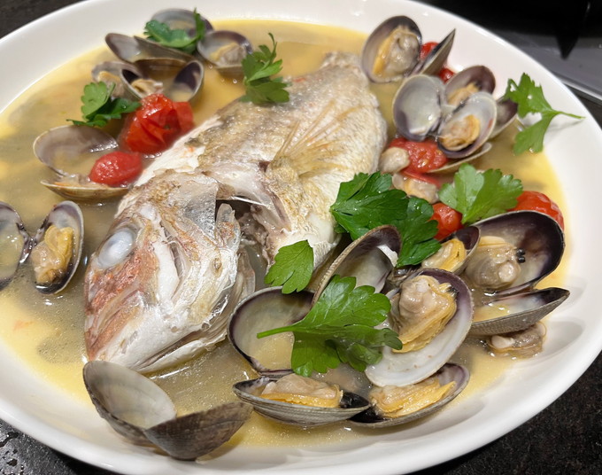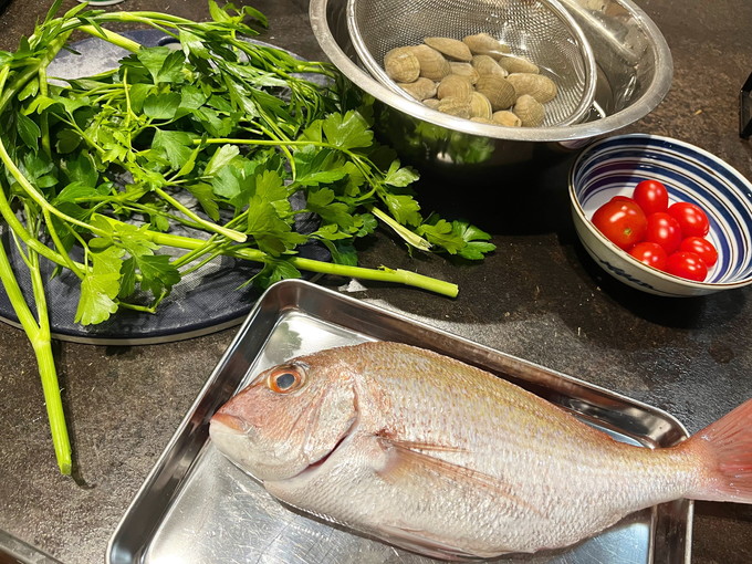 塩味を整えてお皿に盛ってイタリアンパセリを散らし完成。鯛は長女が半分くらい食べて、あさりは三女が半分くらい食べてました。「美味しい!また作って!」とのこと。残ったスープはバゲットに吸わせて余すことなくいただきました。神南産イタリアンパセリは香りが強く野性味があって美味しかったです。