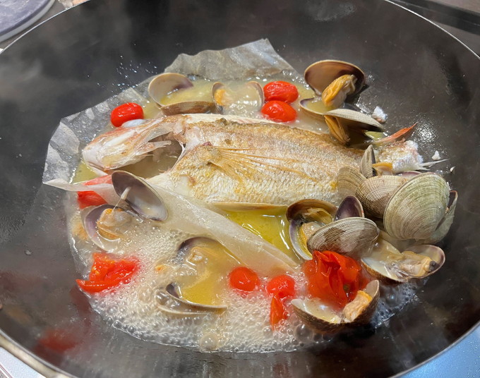 途中で尾が邪魔になったのでカットしたら残念な形になってしまった・・・。気を取り直して両面焼いたら砂抜きしたあさりとミニトマト。リストランテ・アクアパッツァではドライトマトを使うのですが、なかったので何の変哲もない熊本県産のミニトマト。白ワインとWACOMSの水を少し、蒸します。