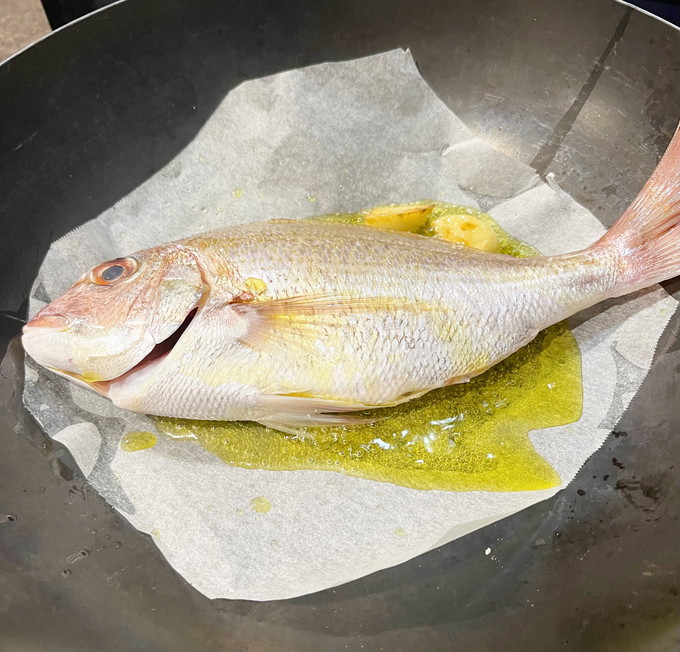 普段使っているティファールのフライパンには入らず、あまり出番のないVitaCraftのスーパー鉄のフライパン33cmのフライパンを出しました。塩をして水分を拭き取ったら、オリーブオイルをにんにくで香りづけして、鯛の表面を焼きます。鍋にくっつく自信しかなかったのでクッキングペーパーを敷きました。
