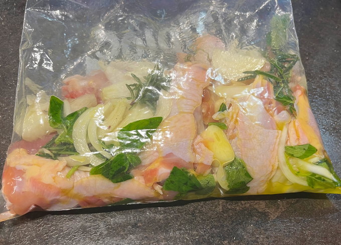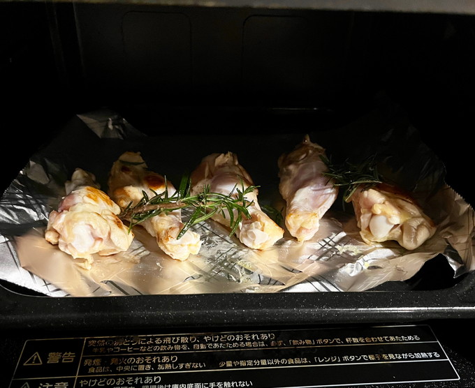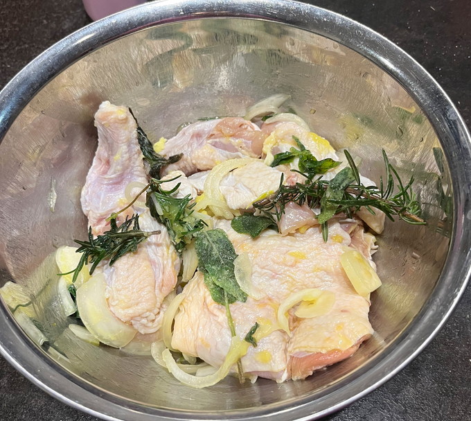 そして翌日用に鶏肉を仕込みました。丸鶏がよかったのですが私の地元スーパーにはおいしいこだわりの丸鶏は売っておらず、土佐はちきん地鶏のももと手羽元。塩をもみこんで水分を拭き取った鶏肉に、にんにく、たまねぎ、ローズマリー、セージ、オレガノ、白ワイン、塩オリーブオイルでマリネ。