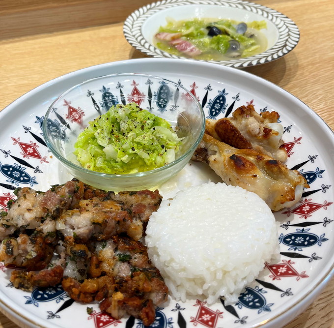 ほかに、朝カバンに入れたのは、新キャベツ、たまねぎの残り、毎度おなじみのしじみ、ベーコンです。厚めの千切りにして塩もみして、酢とオリーブオイルで和えてマヨネーズなしのコールスロー。志麻さんレシピです。新キャベツ、たまねぎの残り、しじみ、ベーコンは炒めてスープに。味付けは塩のみ。美味しい。手羽元も温めて添えて。キャベツだらけになってしまった・・・トマトの色味が必要でした。