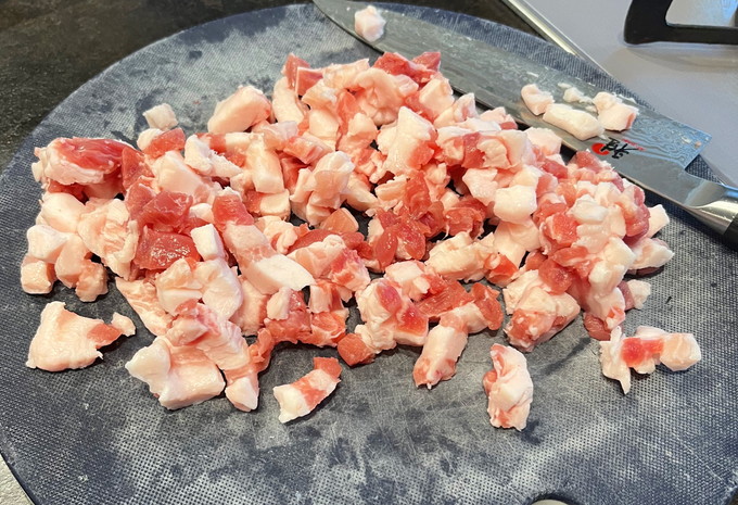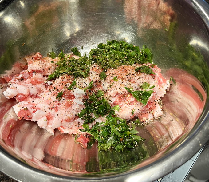 そして続いてサルシッチャ。hayariさんではうで肉を使っているようですが、地元の肉屋にはうで肉はもちろん売っていないので、黒豚の豚バラ肉ブロックをカットしてひき肉を作ります。ちょっと脂が多いので赤身と混ぜれあよかったかも。