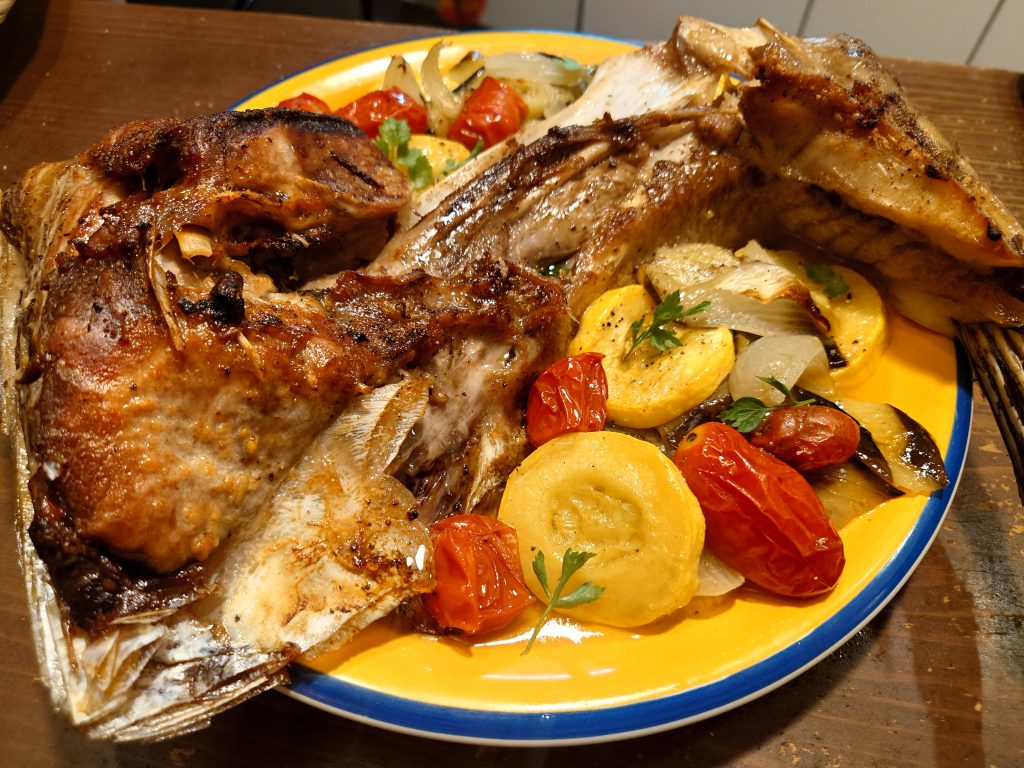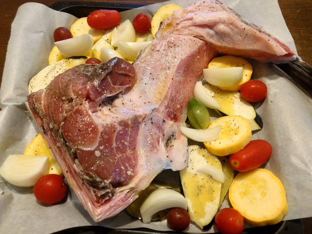 鮪のかまは軽く洗って、水気を拭き取り塩を強めに全体に振る。オープンを250℃に温めておく。お好みの野菜を周りにオリーブオイルをふりかけオーブンで30分くらい。焼き目が付いたら完成。