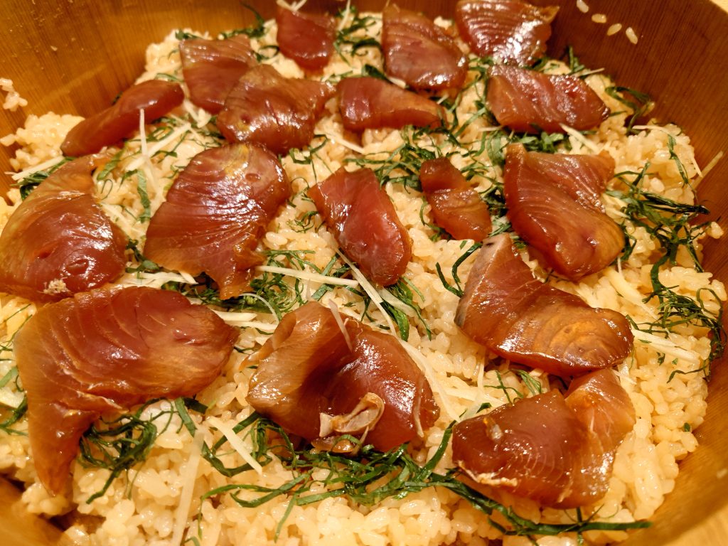 鰹の腹身は醤油、みりんで身を漬け込み。酢飯には赤酢と、鰹を漬け込んだタレを入れる。紫蘇、針生姜、海苔(この時かけ忘れた…)を散らして、大人は追加でみょうがを散らしててこね寿司に。